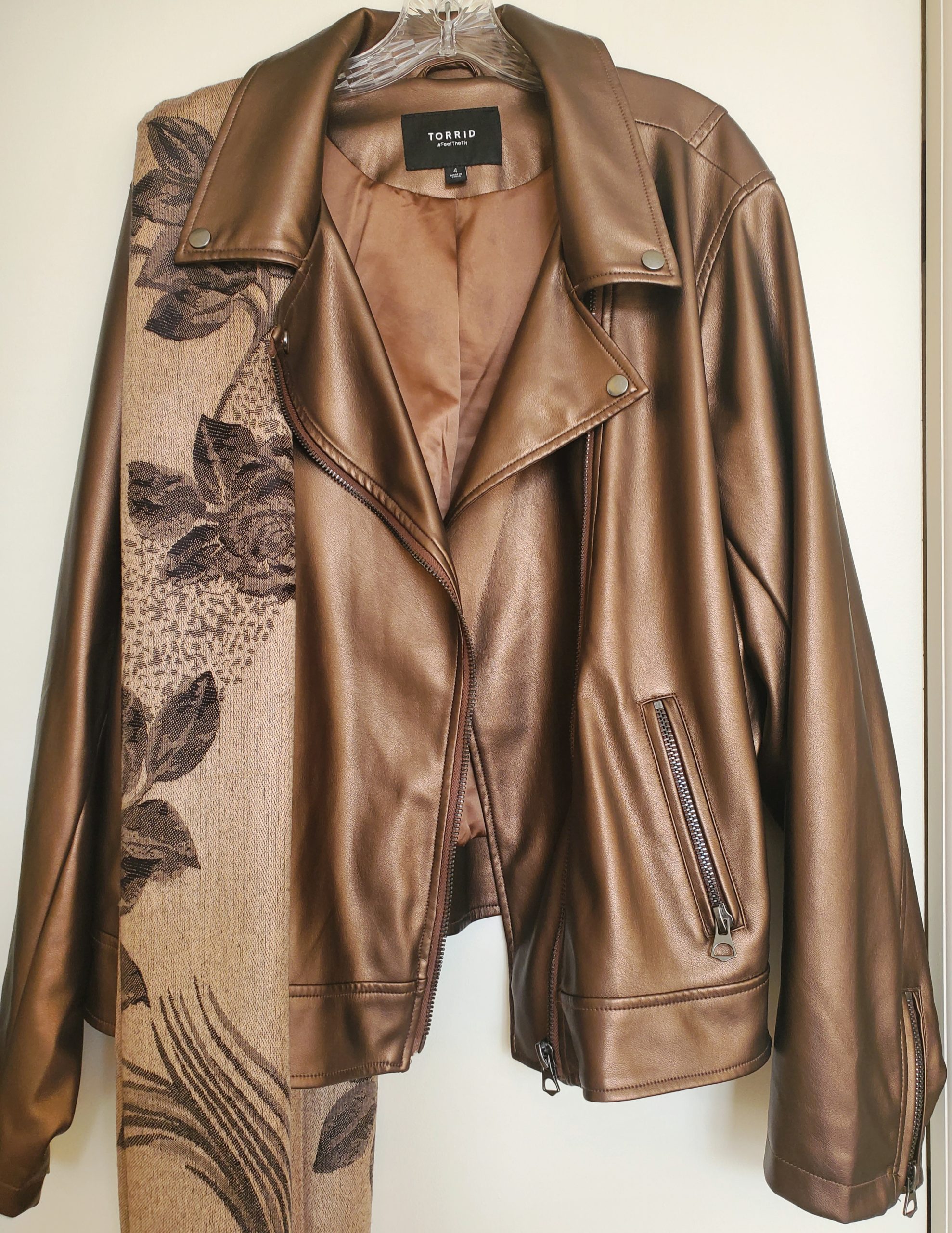 This copper colored, polyester, faux leather jacket is fully lined with zippers throughout, including on the sleeves. (Scarf sold separately.)