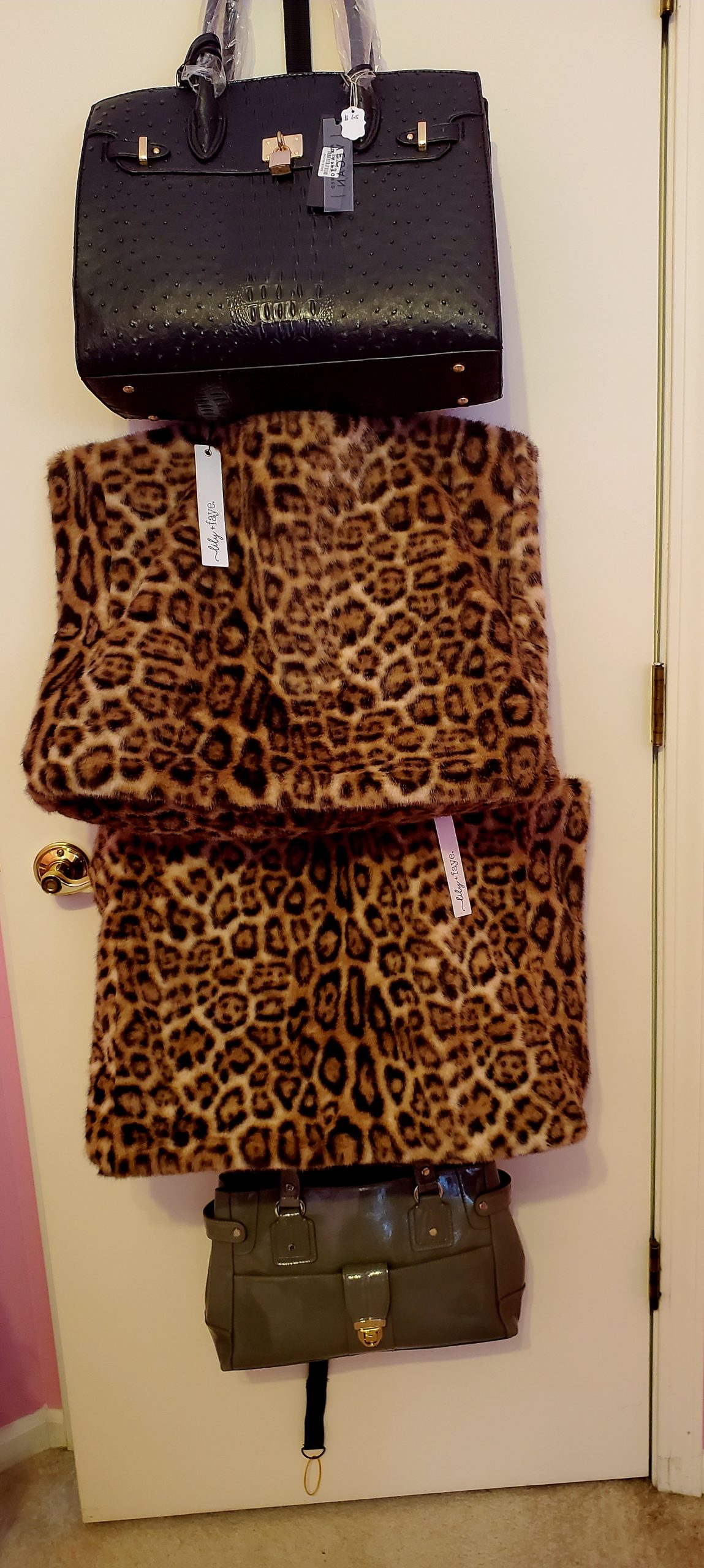 This chic 25 x 15X 9.5″ fully lined carryall is adorned in soft leopard print fur, with two hand straps and a snap closure. It’s adorable for those special things that need to accompany you wherever you go — fabulously. It’s adorable.