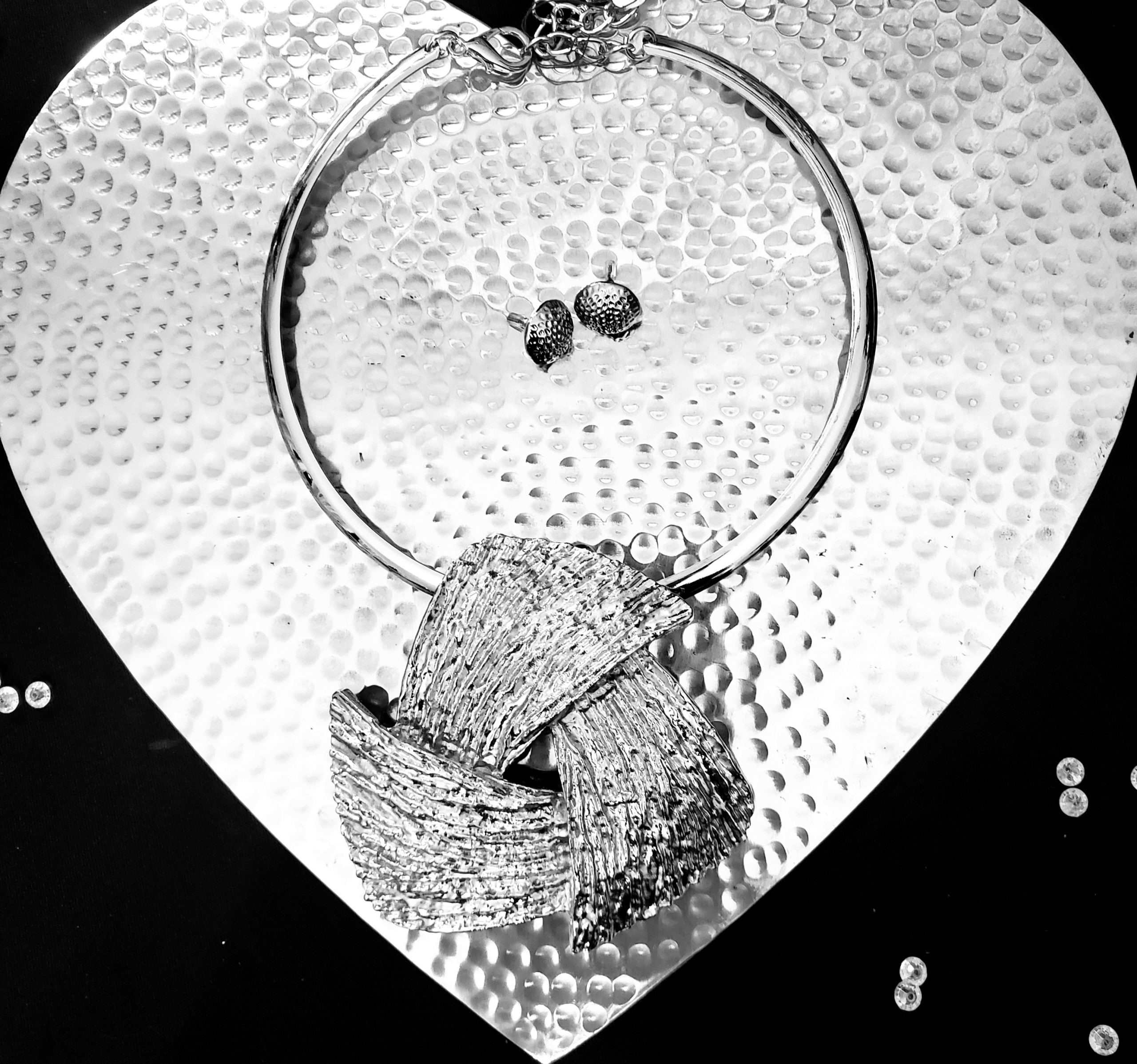 This silver necklace with an amazingly textured silver medallion adds elegance to any outfit! Textured earrings accompany the necklace. Pair it with black and shine!